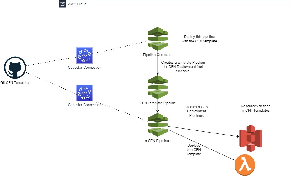 The CloudFormatin Template will create a Pipeline generator pipeline which will create one Pipeline for each Cloudformation template in the cfn-repo.